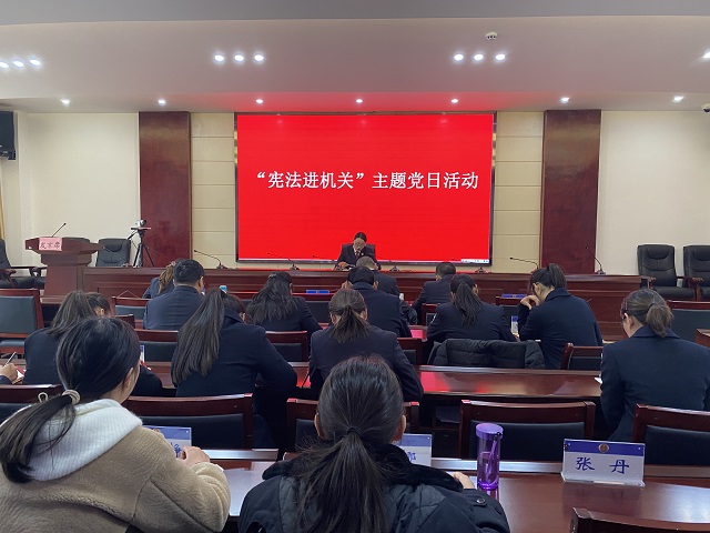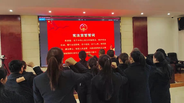 一是为进一步树立尊崇宪法、信仰法治的理念,切实增强干警的职业尊荣感和责任感,开展“宪法进机关”主题党日活动,组织全体干警举行庄严的宪法宣誓活动。